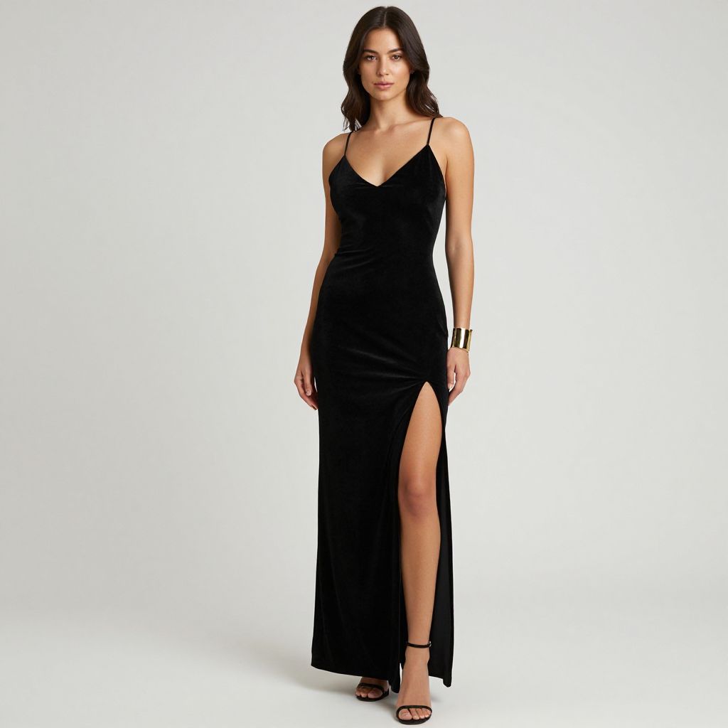 Female model wearing a red dress with a low neckline and a low cut skirt. She has a braid in her hair and is wearing a pair of sandals.