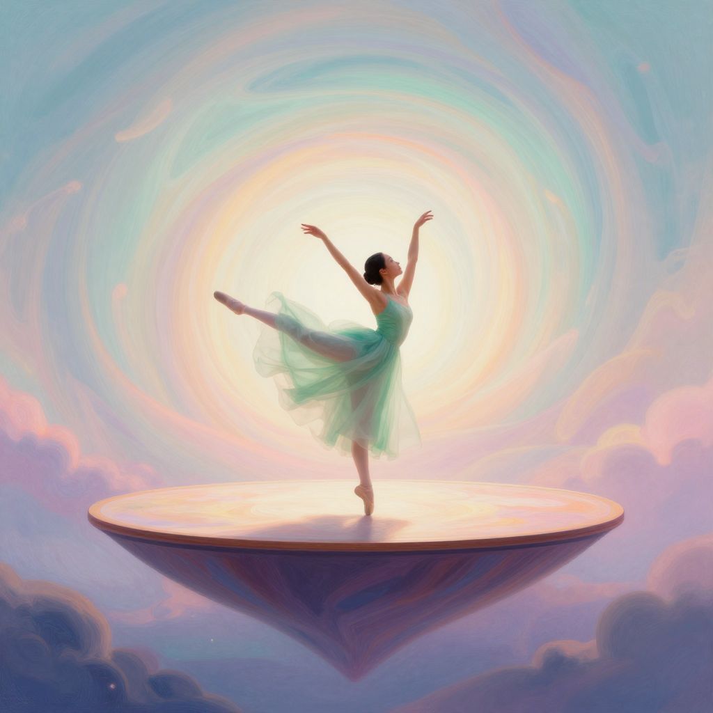 A graceful dancer in an ethereal green gown performs a captivating pirouette on a levitating stage within a mesmerizing whirlpool of soft, pastel hues. Her fluid movements convey both elegance and urgency as she navigates the surreal environment, creating a dynamic emotional spectrum that transitions from serenity to anticipation. The scene is captured from a celestial vantage point, merging digital artistry with impressionistic techniques to evoke a dreamlike ambiance reminiscent of Simon Stålenhag's work, while vibrant colors contrast against the peaceful, atmospheric backgrounds. This enchanting visual tale blends elements of fantasy and dance, inviting viewers to immerse themselves in the beauty and mystique of her performance within an otherworldly realm.
