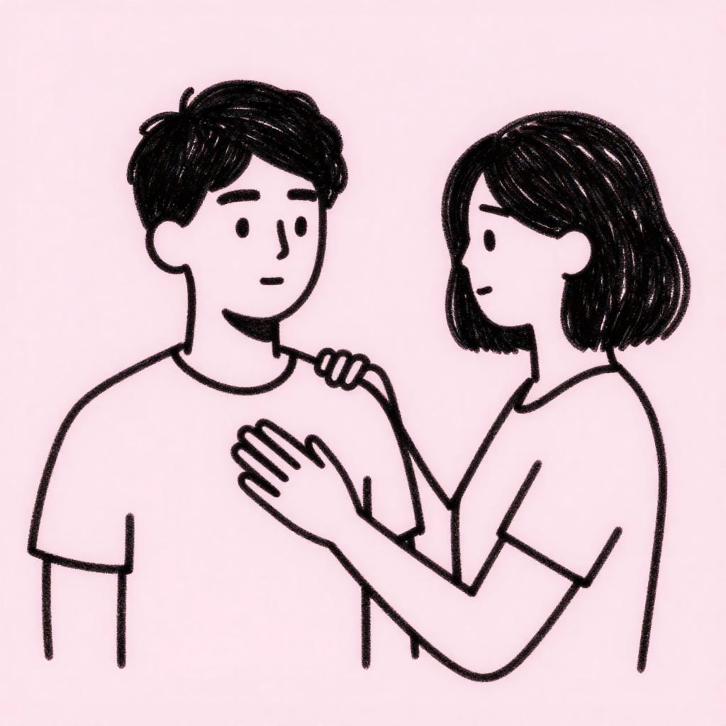 Drawing of two people on a pink background. Both have short, curly hair. The person on the left has a neutral expression, the person on the right gently places their hand on the left person's chest. Sketchy, minimalistic style.