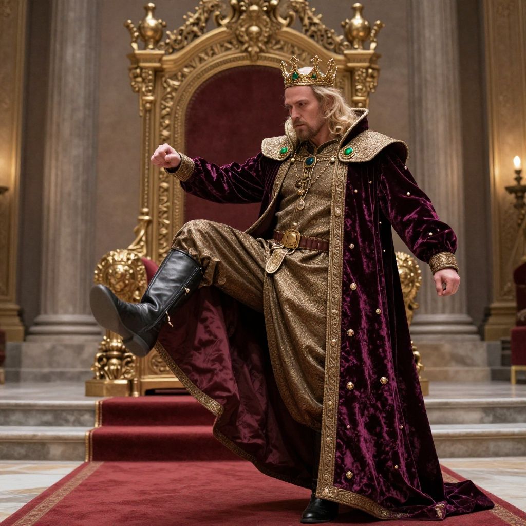 Kicking king costume worn by a powerful monarch in an epic fantasy scene, richly detailed royal garments with velvet textures and jewel accents, kicking off a challenge in a grand throne room, realistic fantasy illustration.