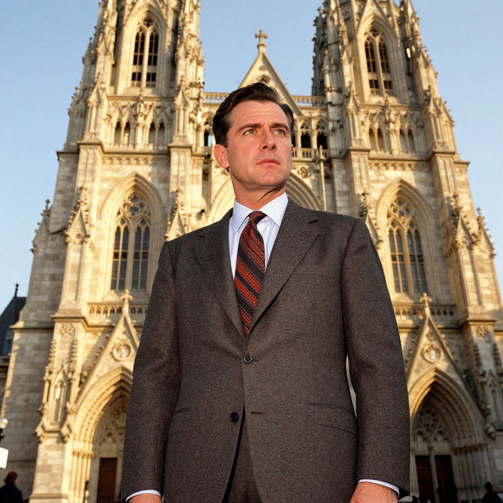 Photograph of a Caucasian man with short dark hair, wearing a black suit, white shirt, and red striped tie, standing in front of a large, Gothic-style cathedral with intricate stone carvings and tall, pointed arches. The cathedral's light beige stone contrasts with the man's dark attire. The sky in the background is clear and blue. The man's expression is serious, and he is positioned centrally in the frame, looking slightly upward. The image has a slight digital enhancement effect, giving it a slightly surreal, almost hyper-realistic appearance.