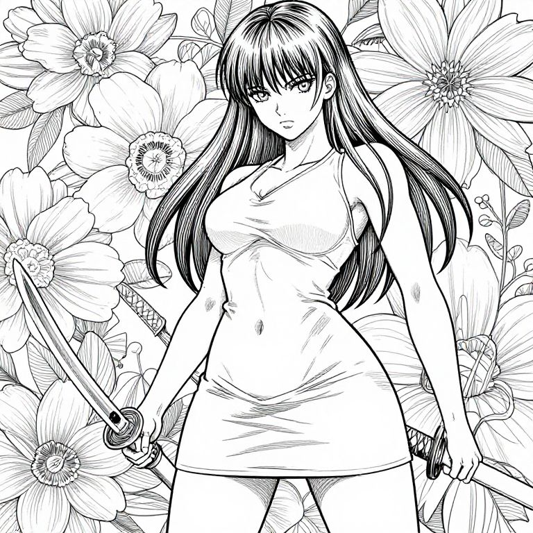 A detailed black and white coloring page features a girl in a tight mini skirt holding katanas, with intricate line work and a floral background, reminiscent of Kenji Kamiyama's style.