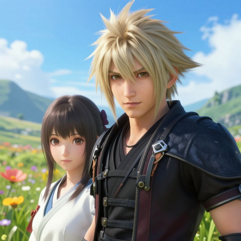 2 person close shot of a person, anime concept art artwork, hyperrealistic art, incredibly lifelike, key visual, vibrant, highly detailed, ffxv 20 years old, (mountain flowers:1) akihiko yoshida