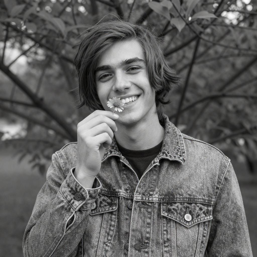 Black and white photo of two young Caucasian men with shaggy hair sitting indoors. The man on the left is leaning on his hand and smiling, wearing a plain t-shirt and jeans. The man on the right is sitting with arms resting on his knees, also smiling and wearing a dark t-shirt. An acoustic guitar is propped against the wall behind them. The background includes a textured wall with a small dark panel and a light square element.