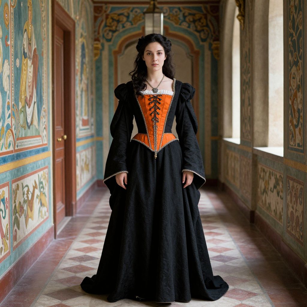 Photograph of a woman with pale skin and dark curly hair standing in an ornate hallway with colorful, detailed wallpaper. She wears a black, long-sleeved, Renaissance-style gown with a voluminous skirt, and an orange, lace-up corset with intricate patterns. The hallway has a polished checkered floor, wooden doors, and arched windows allowing natural light. The woman's expression is solemn, and she stands confidently in the center of the hall. The overall atmosphere is rich and historical, with a focus on the elaborate clothing and decor.