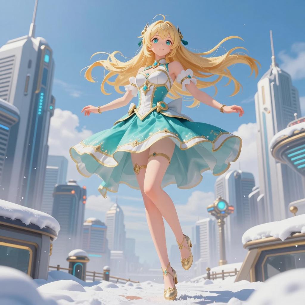 Anime-style young woman with flowing blonde hair and bright blue eyes, wearing an elaborate turquoise and gold dress with white accents and golden accessories. She is poised elegantly in the air above a modern cityscape featuring futuristic skyscrapers under a bright blue sky. Snow covers rooftops and structures, adding a wintery touch to the vibrant fantasy setting with detailed shading and strong lighting effects.