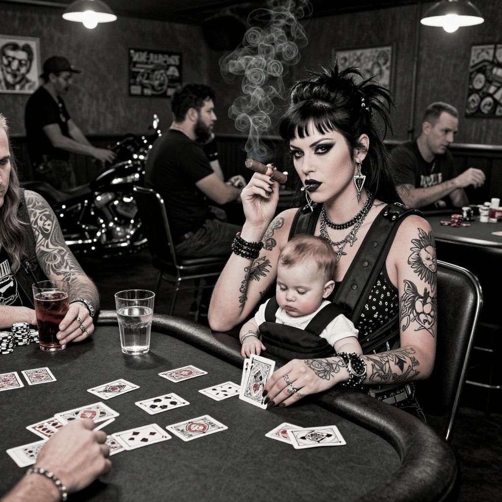 Gothic woman with tattoos, smoking, holding baby, playing poker in dimly lit bar. Card table, glass, other patrons in background. Phot