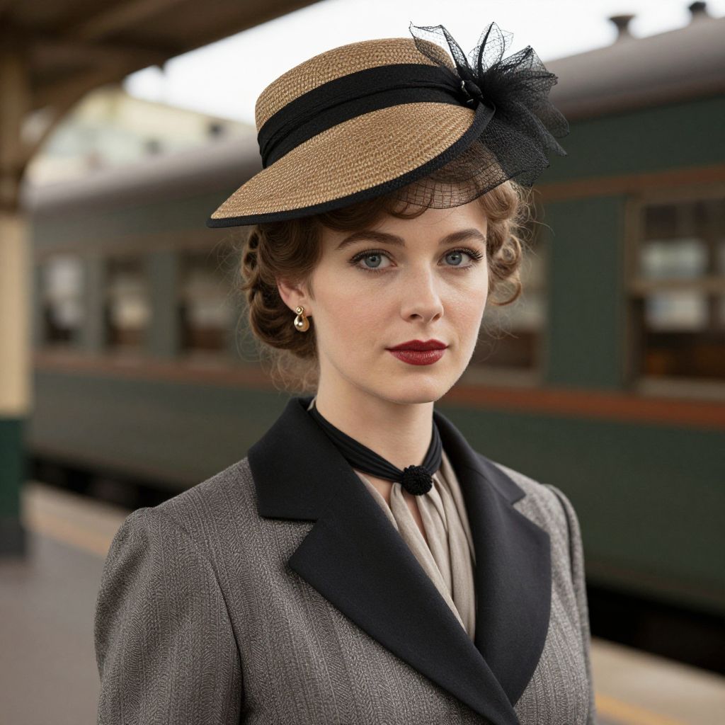Photograph of a fair-skinned, blue-eyed woman with short, curly brown hair, wearing a beige straw hat with a black ribbon and black netting. She has red lipstick and small pearl earrings. She wears a gray, textured wool blazer with black lapels over a beige blouse, tied with a black bow at the collar. She stands in a train station, with a green and brown train visible in the blurred background. The station has a wooden roof and platform. The overall style is vintage, evoking early 20th-century fashion.