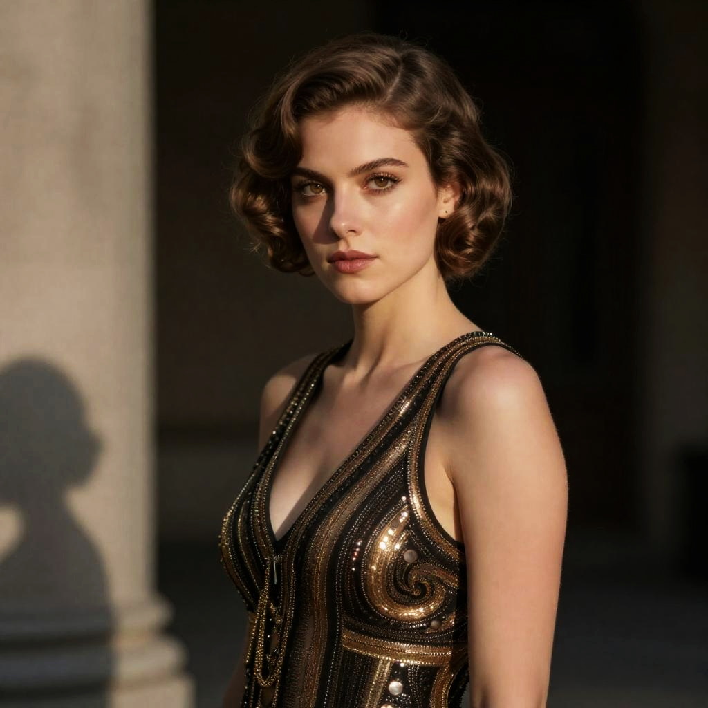 8K, (best quality:1.3), (masterpiece:1.3), (detailed:1.2), distinct image, ((portrait shot)), ((photogenic, rule of thirds)), RAW photo, (realistic art style:1.2)(Photorealistic Natural Human Body), sharp focus, deep colors, deep shadowsSolo, looking at viewer, impressive expression, Tapered body, ((Side-set breast)), High Cheekbones face, Tapered Cut Light Ash Brown hairs, Amber eyes, 1920s Flapper costume, natural volumetric lighting