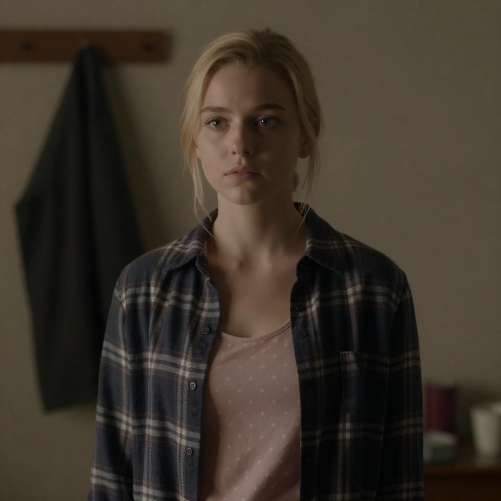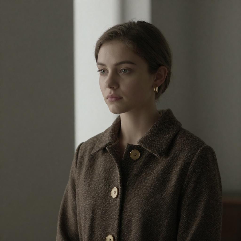 Photograph of a young woman with fair skin and blonde hair, wearing a green headband and a red velvet vest with gold trim over a teal shirt. She has blue eyes and a focused expression. The background is softly lit with warm tones, and a blurred object is visible on the right.