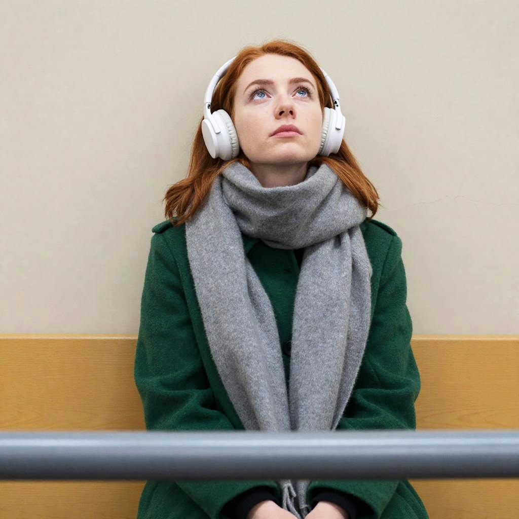 Photograph of a young woman with red hair, wearing white headphones, green coat, and gray scarf, looking up intently. She is seated against a cracked, beige wall with a yellow wooden surface below. Foreground includes a blurred metal bar.