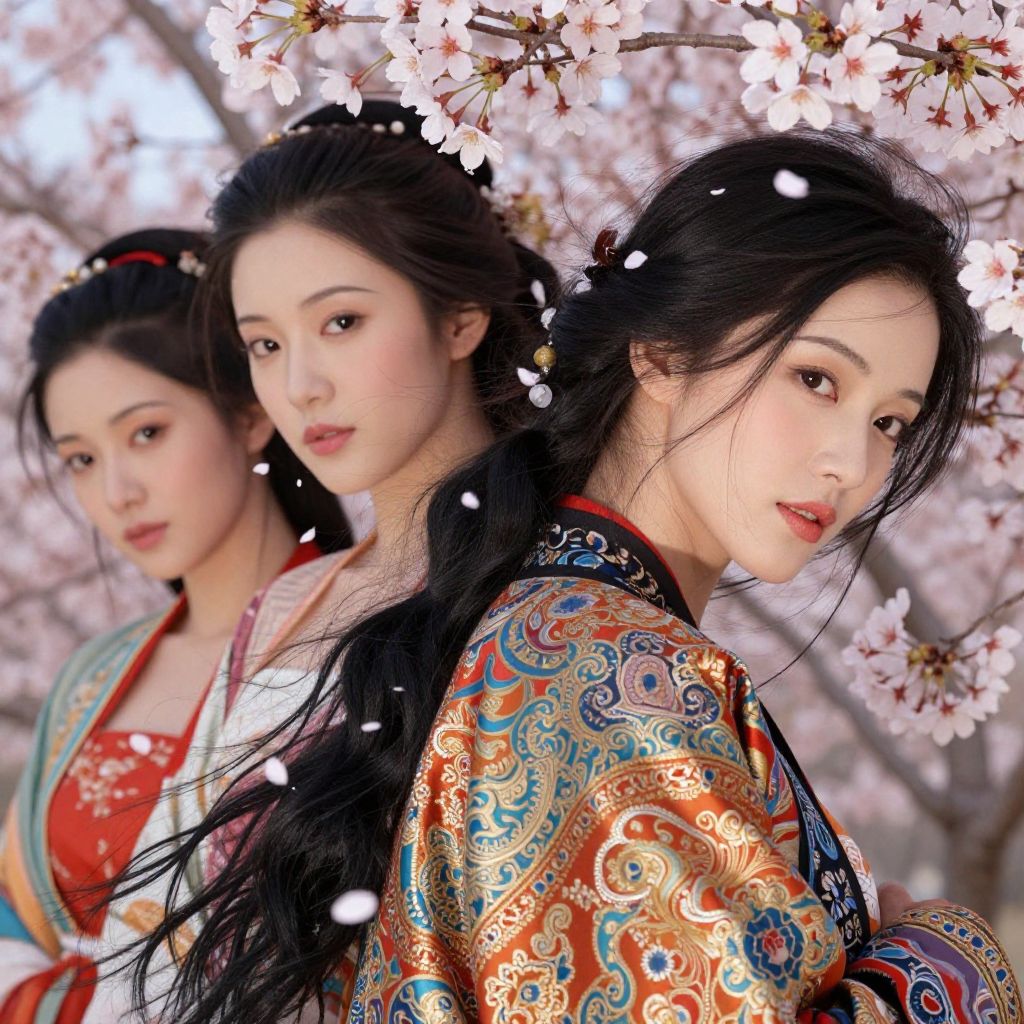 Beautiful women with black hair in traditional Asian attire, intricate silk patterns and vibrant colors, surrounded by cherry blossoms in full bloom, soft wind, delicate petals falling, cultural elegance, detailed face features, vibrant background, artistic composition