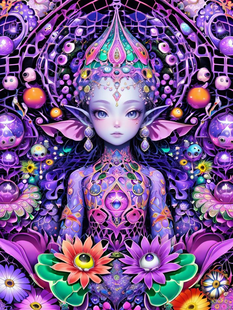A fantastical elf-like creature with purple skin and large pointed ears, adorned with a colorful jeweled crown and intricate floral patterns on her body, surrounded by an array of vibrant flowers including daisies, chrysanthemums, and various surreal eyeball-like orbs, set against a psychedelic background featuring a grid structure and multicolored glowing elements, the scene exudes a surreal and ornamental fantasy vibe with rich pink, purple, green, and orange colors