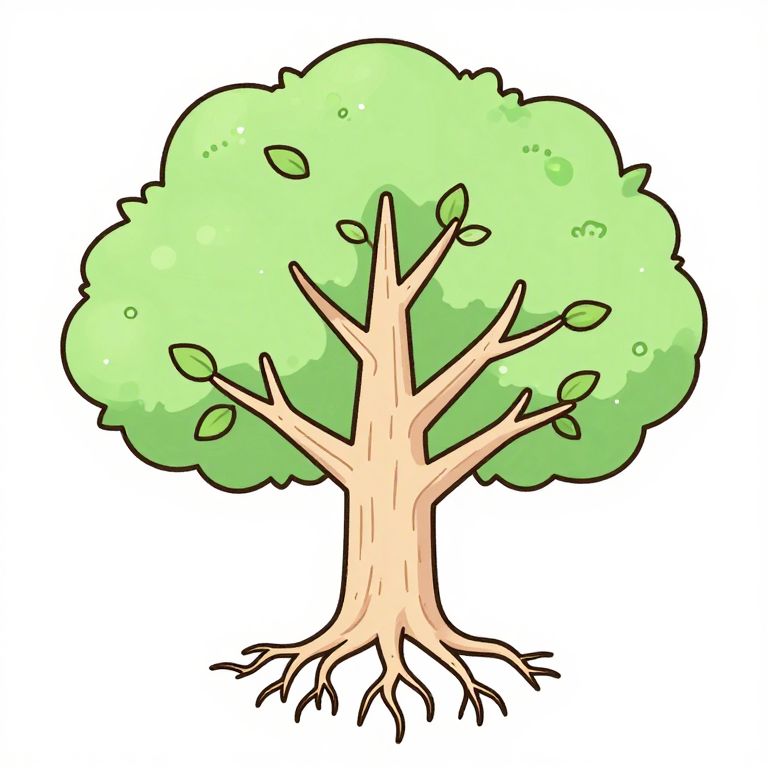 Colorful cartoon-style drawing of a green leafy tree with a light beige trunk and visible roots, set against a plain white background.