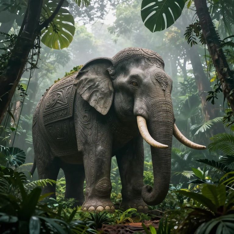 Photorealistic CGI of an intricately patterned, ancient-style elephant with long ivory tusks standing in a lush, dense jungle.
