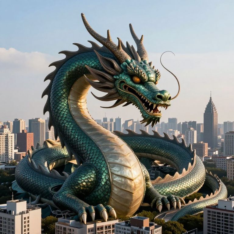 CGI image of a massive, teal-scaled Chinese dragon with glowing orange eyes, sharp teeth, and long, curved horns, towering over a modern cityscape. The dragon's sinuous body coils around skyscrapers, with its golden underbelly contrasting against the blue-green scales. In the background, a clear sky with soft sunlight illuminates the city's tall buildings, including a recognizable, pointed skyscraper. The dragon's fierce expression and detailed texture add a sense of realism to the fantastical creature. The image blends fantasy elements with a realistic city setting.