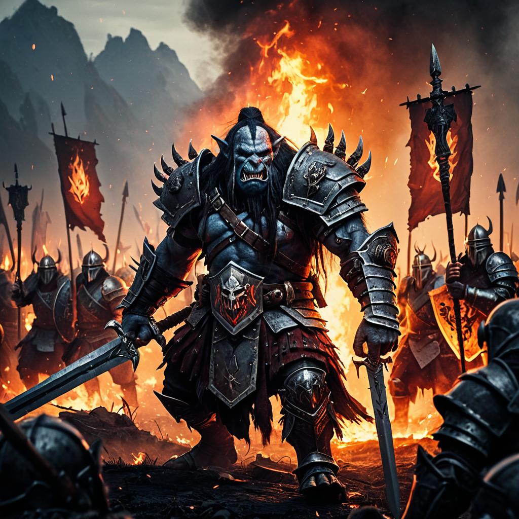 A fierce troll chieftain leading a swarm of mangy cave gnolls, in a twilight desert ruin beneath cracked heavens, holding a heavy obsidian cleaver, grim and relentless, with buzzing dust devils, shattered statues around, epic and dramatic