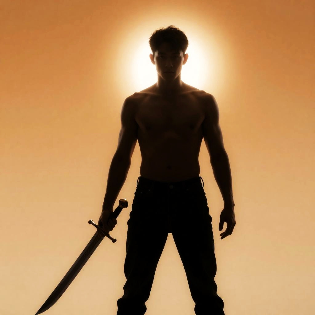 Silhouetted man with short hair, muscular build, standing against an orange and yellow gradient background. He holds a curved sword in his right hand, positioned at his side. Bright light surrounds his head, creating a halo effect.