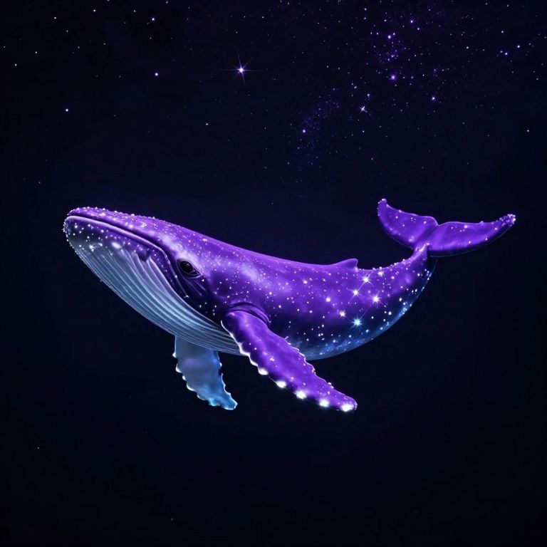 Digital artwork of a glowing, purple and blue whale surrounded by sparkling stars, floating in a dark, star-filled night sky.