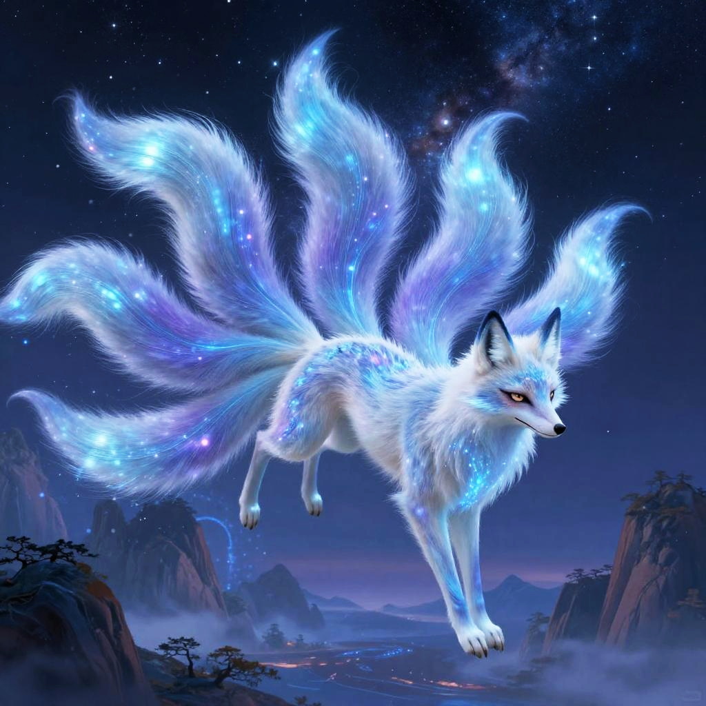 Digital art of a glowing, multi-tailed white fox with blue and purple ethereal fur, flying against a starry night sky over a misty