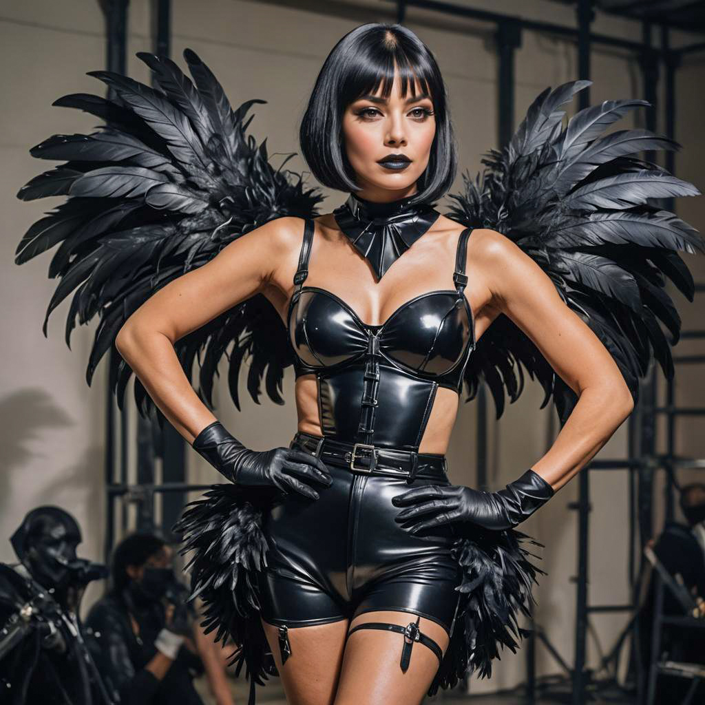 Portrait of a svelte woman with a bold bob hairstyle wearing a black latex bra, high-waisted shorts with feathered volume boosters, long gloves, and large black feather wings. The outfit is harnessed and styled for an artistic, expressive look against a neutral background.