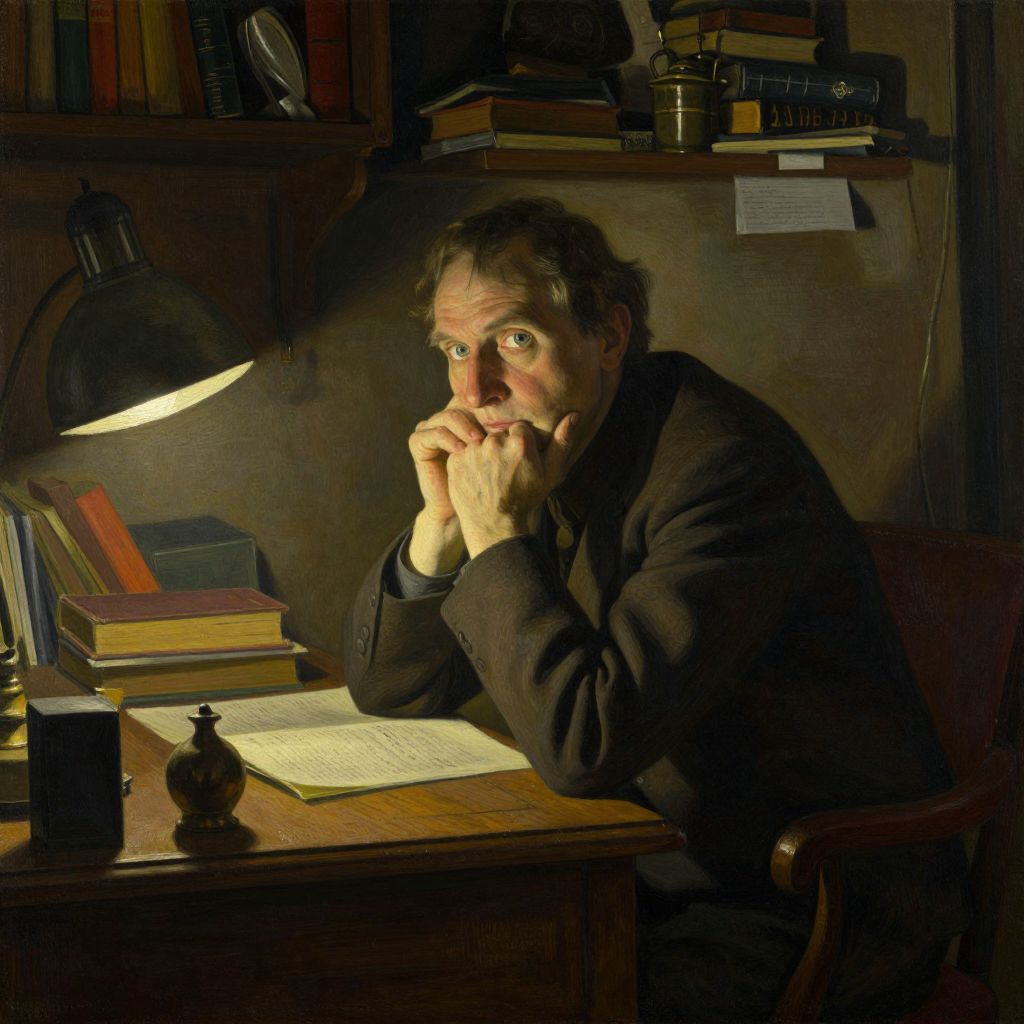 A photograph-style oil painting depicts a middle-aged man with a contemplative expression, sitting at a wooden desk in a dimly lit room. He has receding brown hair and wears a dark brown coat. His hands rest on his chin. The desk holds a stack of books, an open notebook, a black lamp with a white light, and a small, ornate inkwell. Shelves in the background are filled with more books and a few scattered papers. The warm, shadowy lighting creates a moody, introspective atmosphere. The man's gaze is directed towards the viewer, adding a sense of engagement and curiosity.