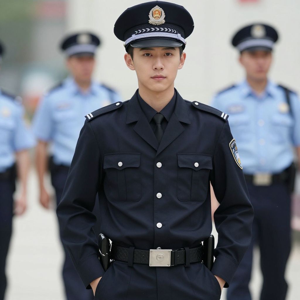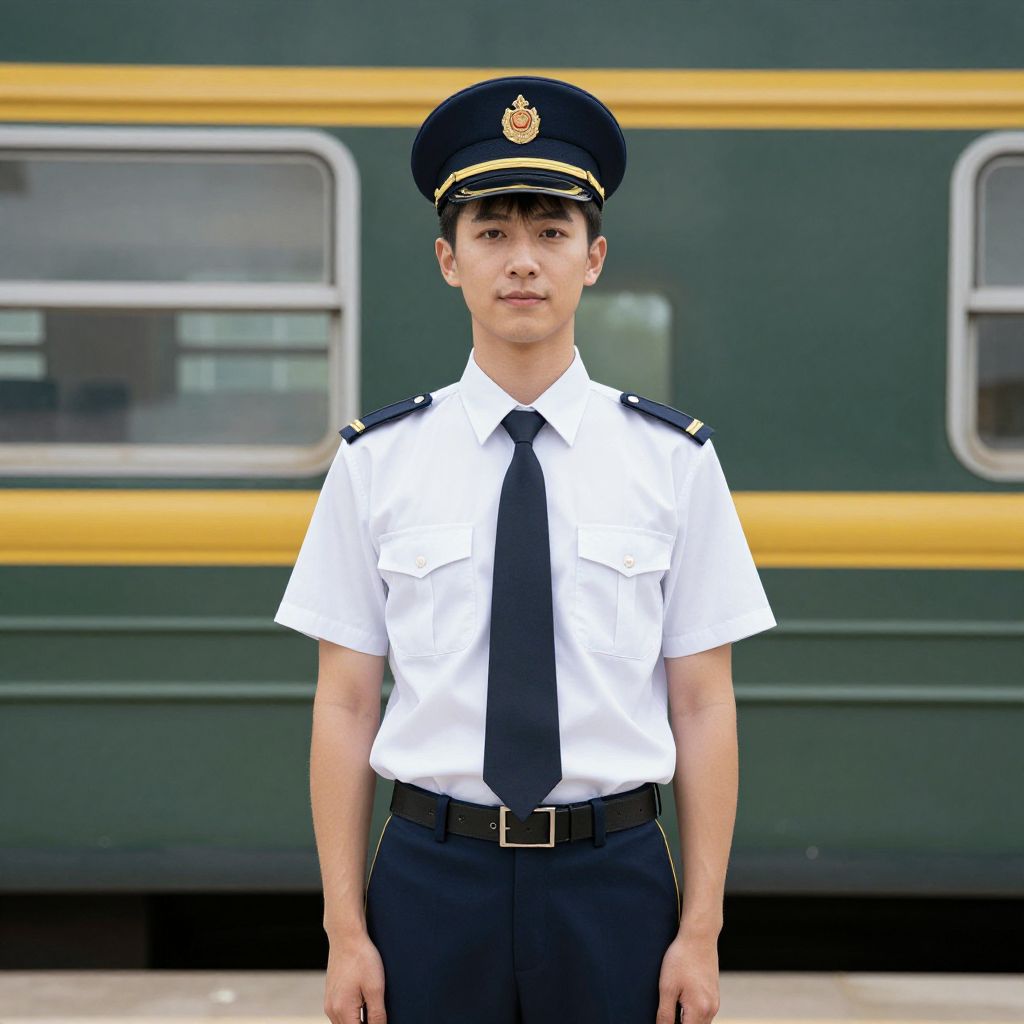 Photograph of a young Asian male train conductor standing in front of a green train with yellow stripes. He has short black hair, fair skin, and a serious expression. He wears a black train conductor's cap with a gold emblem, a white short-sleeve shirt with black shoulder epaulettes, a black tie, and black pants with a black belt. The train's windows are visible in the background, and the platform is slightly out of focus. The image is brightly lit with natural daylight.