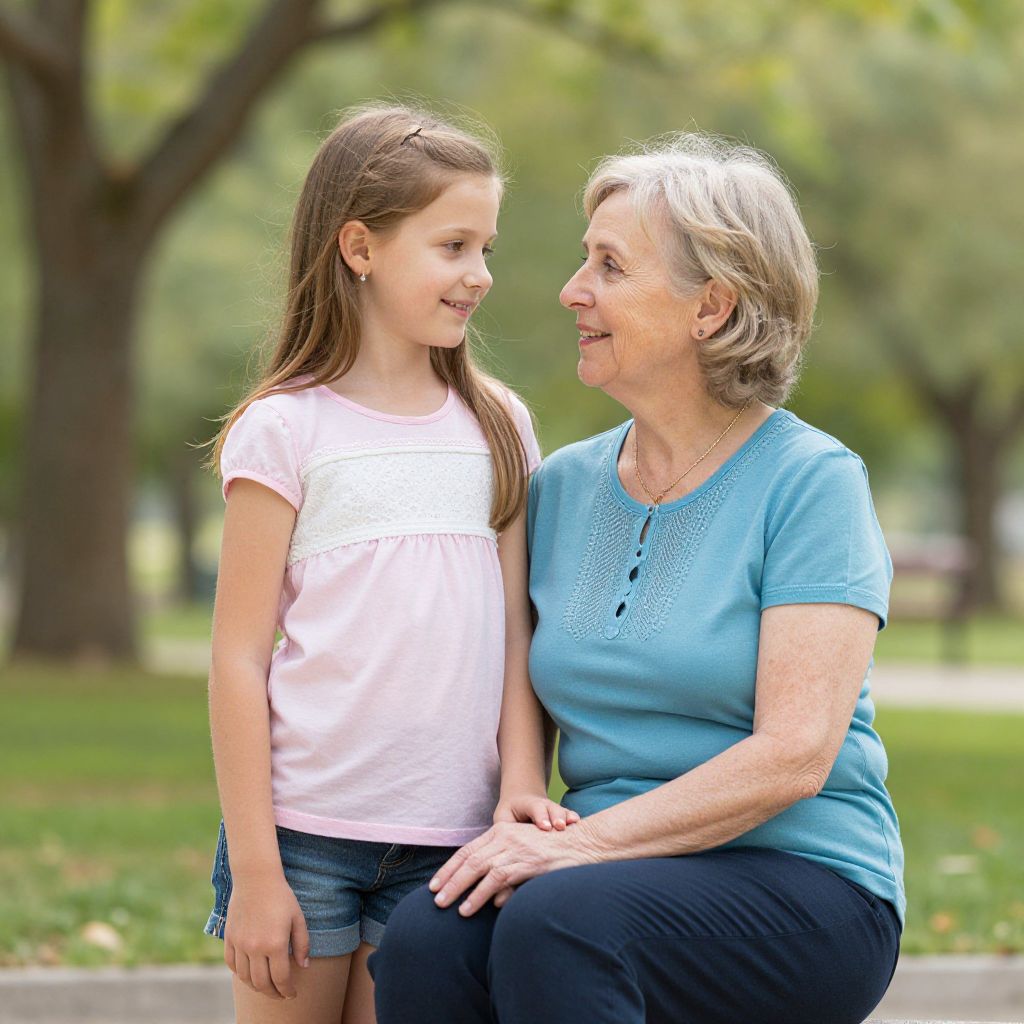 Photograph of an older white woman with blonde hair, wearing a red short-sleeve top, white pants, and a pearl necklace, sitting on a grassy park bench with a young white girl, around 8-10 years old, with long brown hair, wearing a white and pink striped sleeveless top and blue jeans. The girl is seated to the woman's left, leaning slightly towards her, with her right arm around the woman's waist. Both are smiling warmly at the camera. The background features blurred green trees and sunlight filtering through, creating a bright and cheerful outdoor setting. The woman's skin is fair, and the girl's skin is slightly tanned.