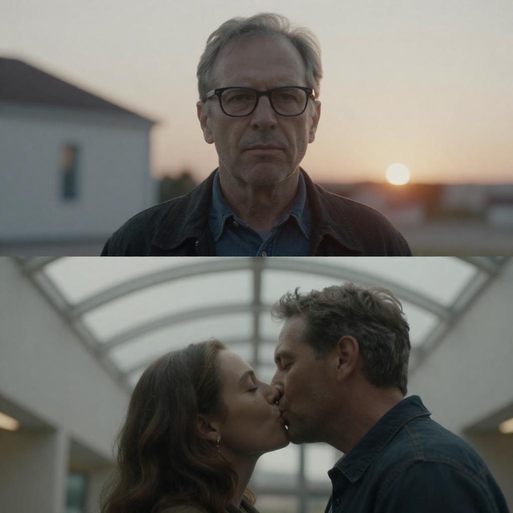 Split-image photograph. Top: older man with gray hair and glasses, serious expression, sunset background, white building. Bottom: man and woman kissing, romantic, glass ceiling, modern architecture.
