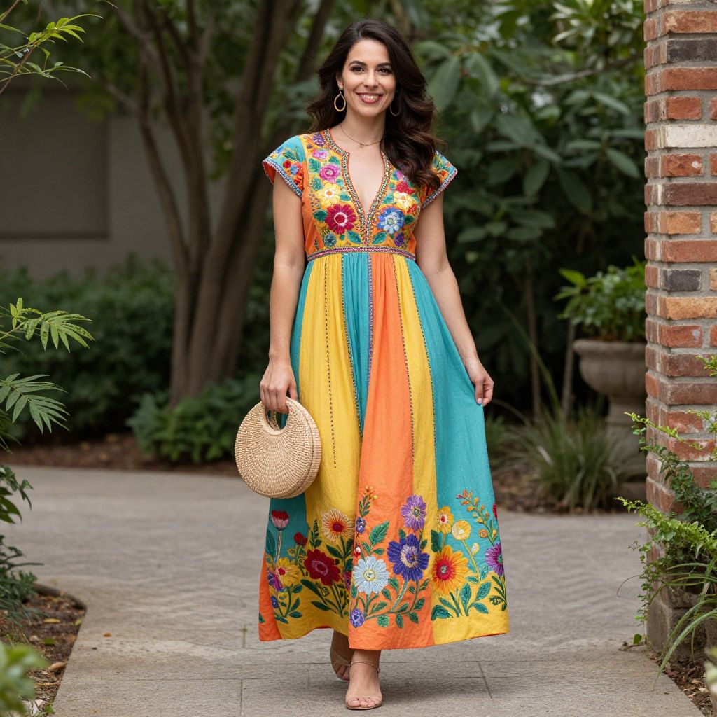 Photograph of a smiling young woman with dark, wavy hair, wearing a vibrant, knee-length dress. The dress has a turquoise bodice with floral embroidery, yellow and blue vertical stripes, and colorful flower patterns at the hem. She holds a woven straw clutch in her right hand and wears open-toed sandals. The background features a brick building, green bushes, and grass along a concrete sidewalk. The overall style is bright and summery.