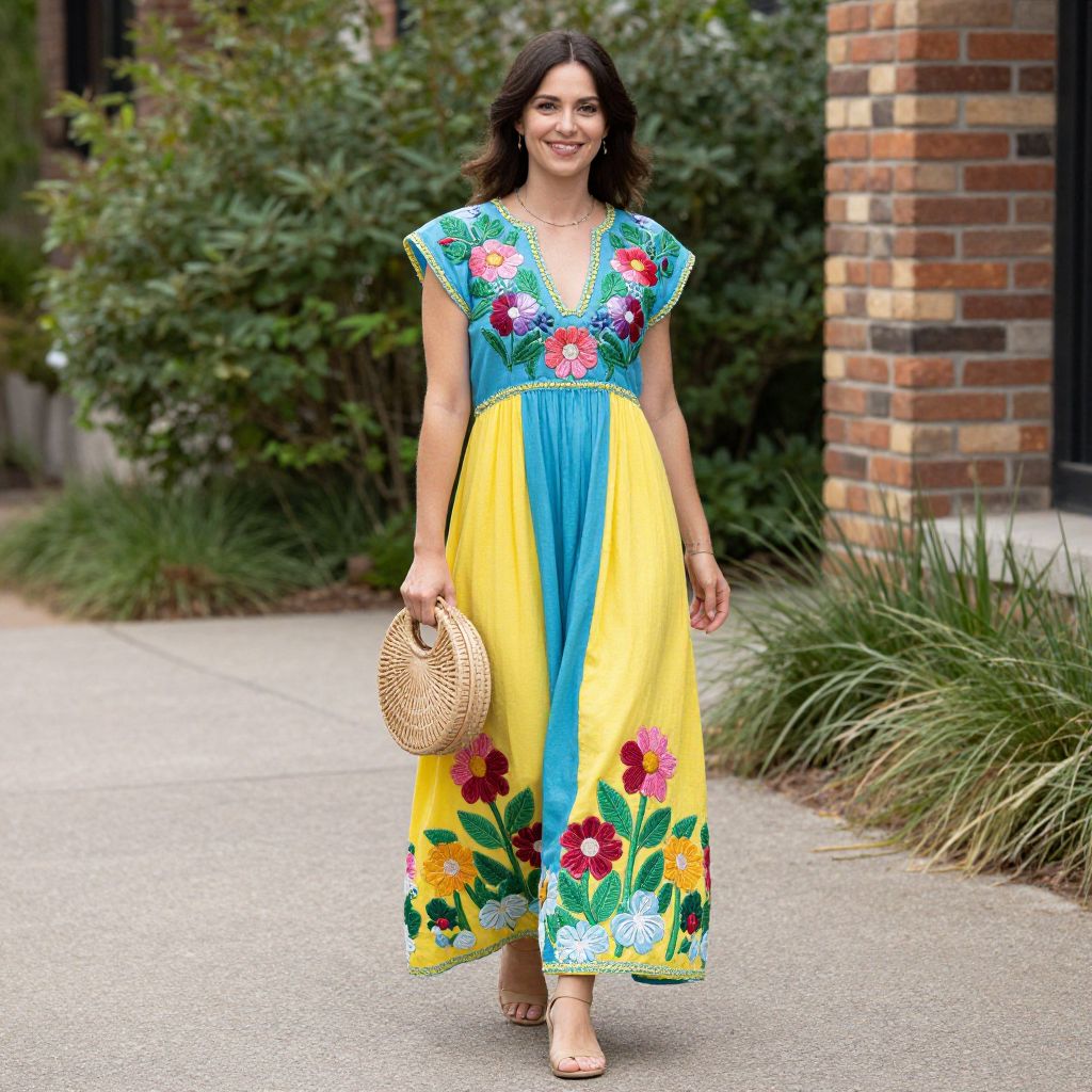 Photograph of a smiling woman with dark hair in a vibrant, floral-embroidered blue and yellow dress, holding a wicker purse, walking