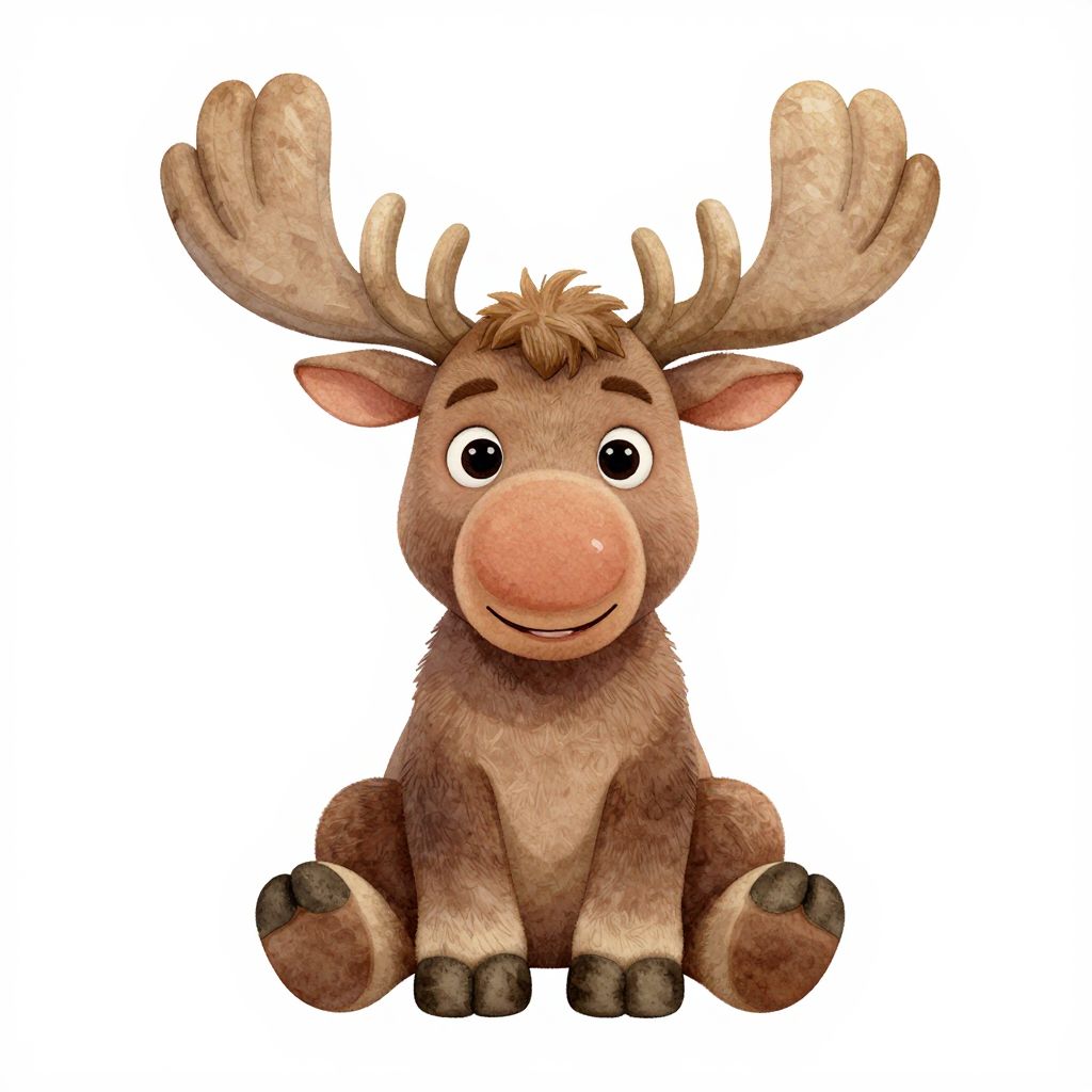 A cute, cartoonish moose with large antlers and a friendly smile, depicted in a clean watercolor style on a white background, exuding a childlike charm.