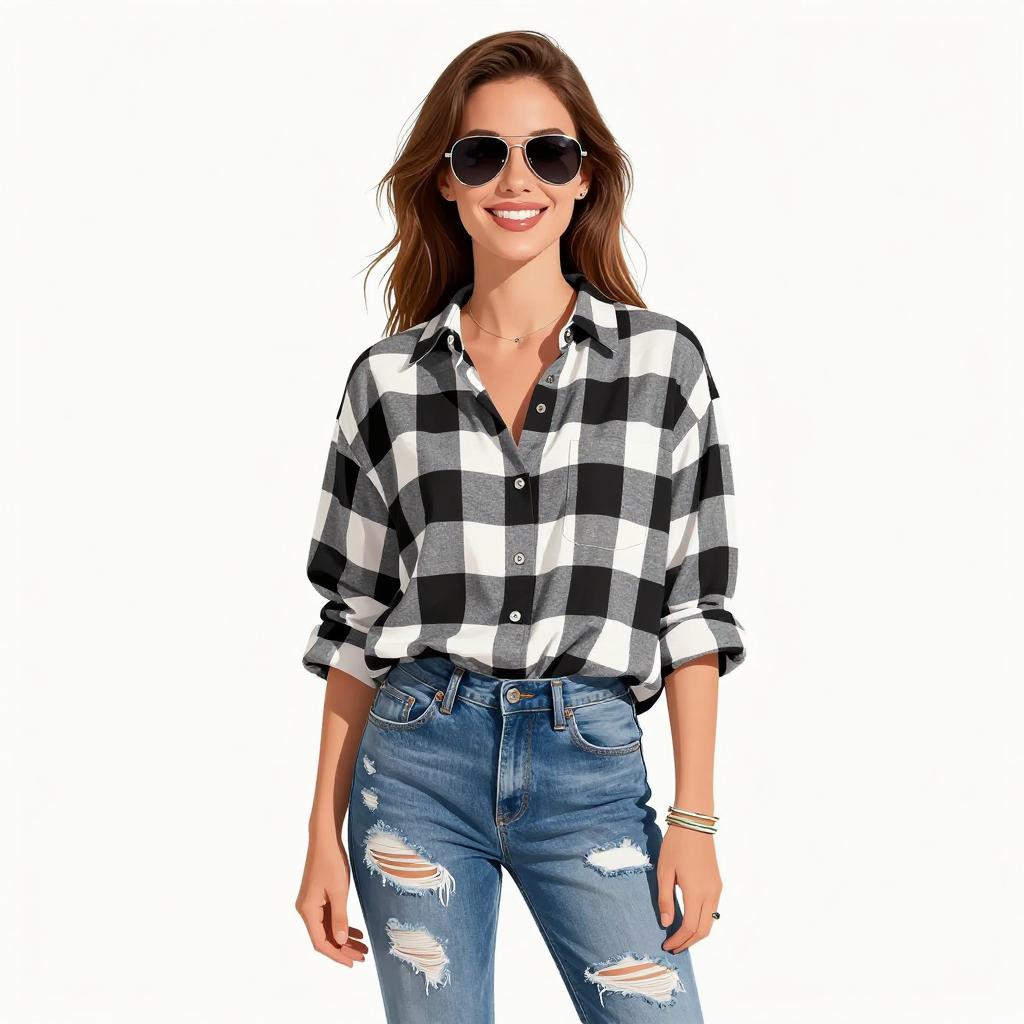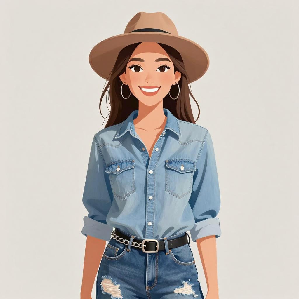 Woman with pretty face and pretty hair. smiling Woman, casual, mid-wash blue denim shirt, long sleeves rolled to the elbows, two chest pockets with flaps, button-down front, black slim-fit faux leather pants, aviator sunglasses with reflective blue lenses. --sref 1467