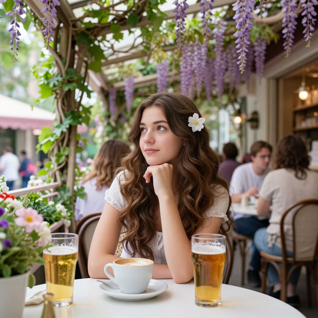 Photograph of a young woman with long, wavy brown hair adorned with a white flower, sitting at a white table in an outdoor café. She wears a white, short-sleeved top and gazes thoughtfully to the right, resting her chin on her hand. In front of her are a white teacup on a saucer and two glasses of amber beer. Purple wisteria flowers hang overhead, and the background shows blurred patrons and greenery. The setting is bright and lively, with soft natural light filtering through the vines. The woman's fair skin and delicate features contrast with the vibrant, floral surroundings.