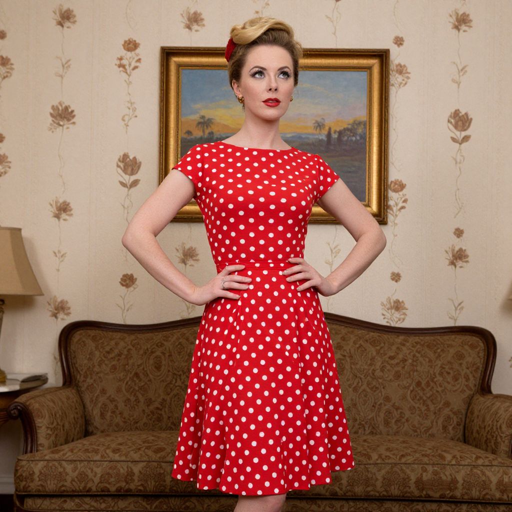 Woman wearing a vibrant red polka-dot dress from the 1960s stands gracefully in a vintage living room, her hands resting on her hips as she gazes thoughtfully to the side, surrounded by floral wallpaper, a framed painting, and a patterned sofa.