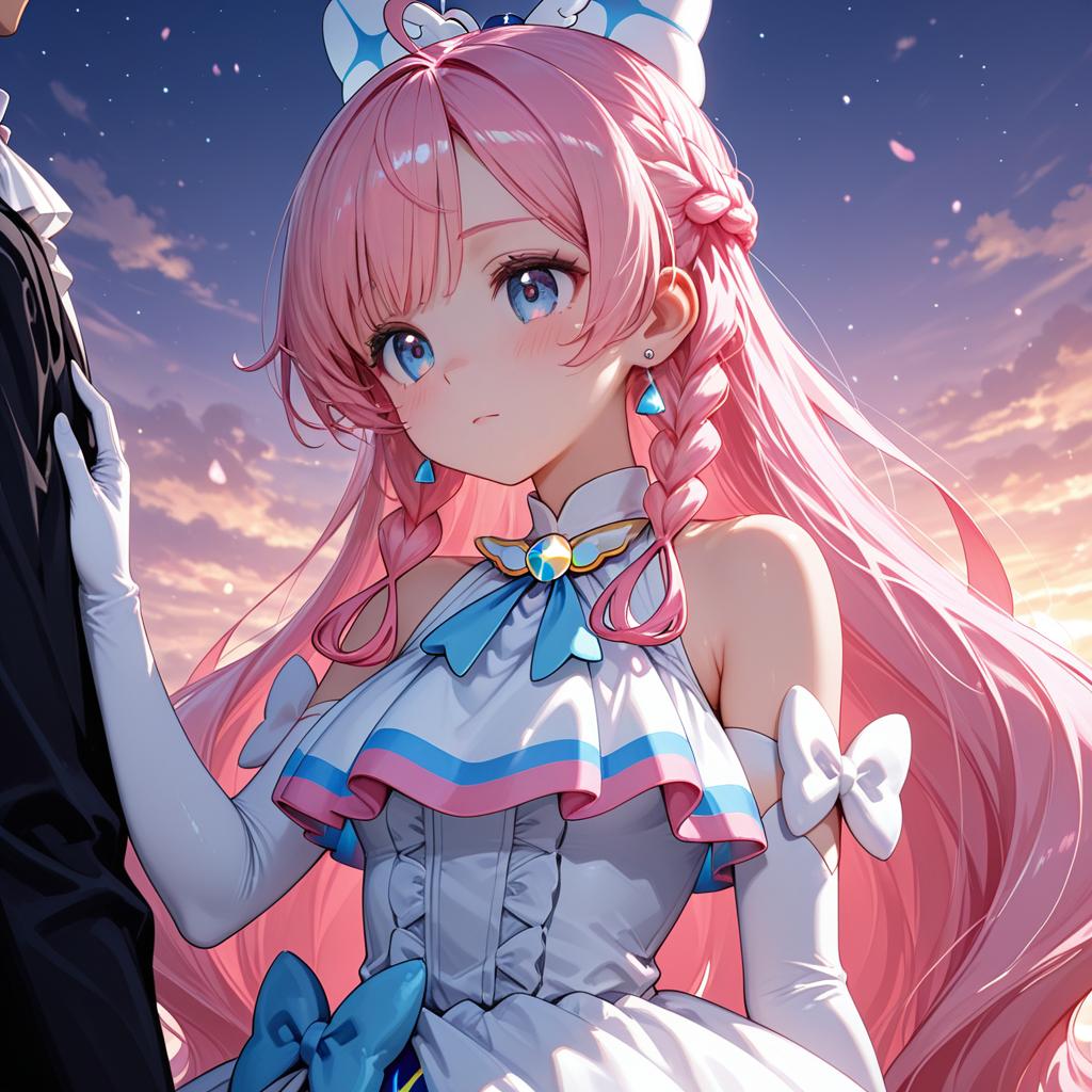 Anime-style illustration of a magical girl with very long pink braided hair, blue eyes, and a heart-shaped ahoge. She wears a white sleeveless dress with blue and pink trim, white elbow-length gloves, white bows, blue triangular earrings, and a winged brooch on her white ascot. The background features a twilight sky with soft clouds and stars.