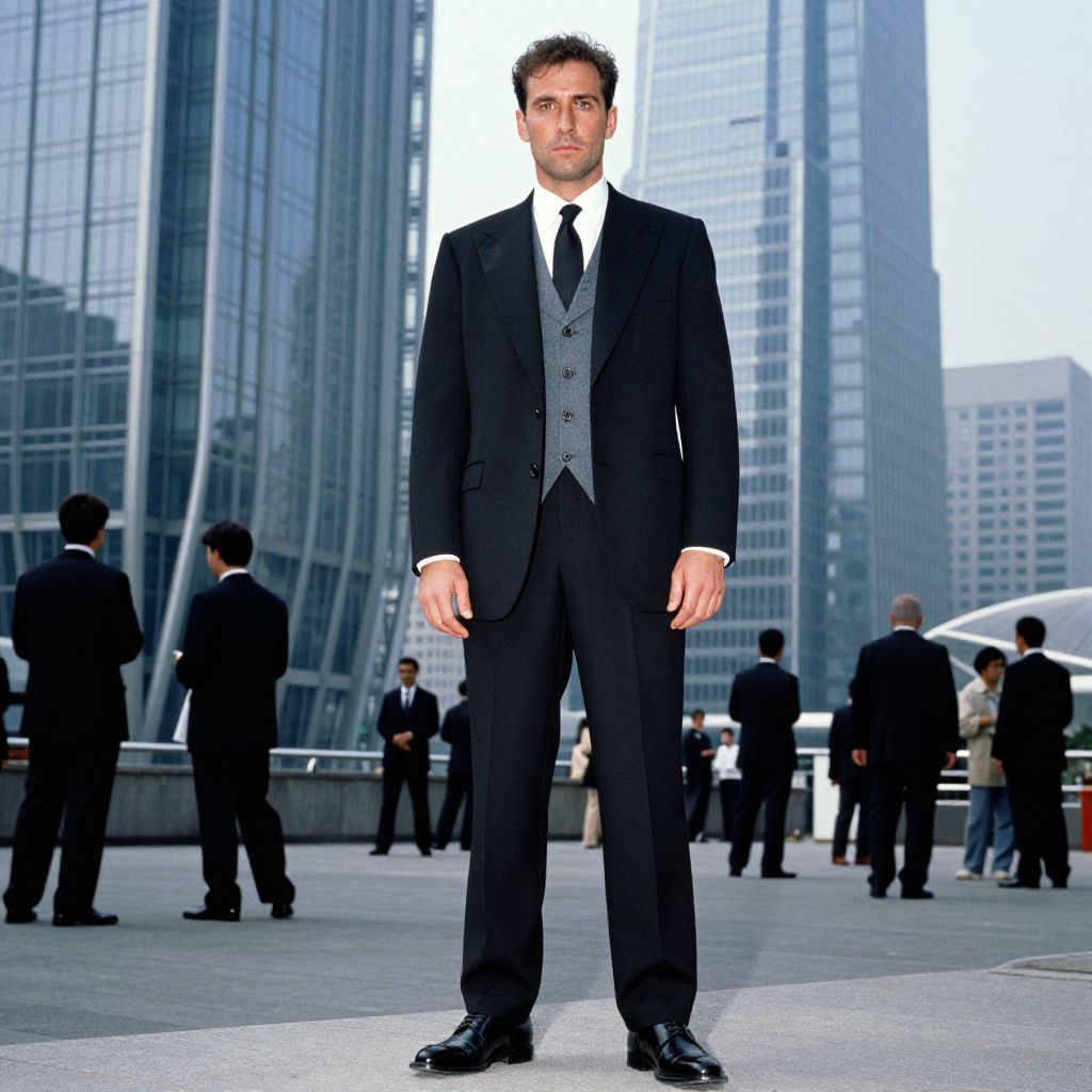 Photograph of a tall, handsome man with short, dark brown hair and fair skin standing in a modern urban plaza. He is wearing a black suit with a white shirt and a grey patterned waistcoat, paired with black dress shoes. The background features tall, glass skyscrapers reflecting the blue sky. Several other men in black suits are scattered around the plaza, some standing and some walking. The lighting is bright, highlighting the sleek, contemporary architecture. The man's confident stance and direct gaze suggest he is the focal point of the image.