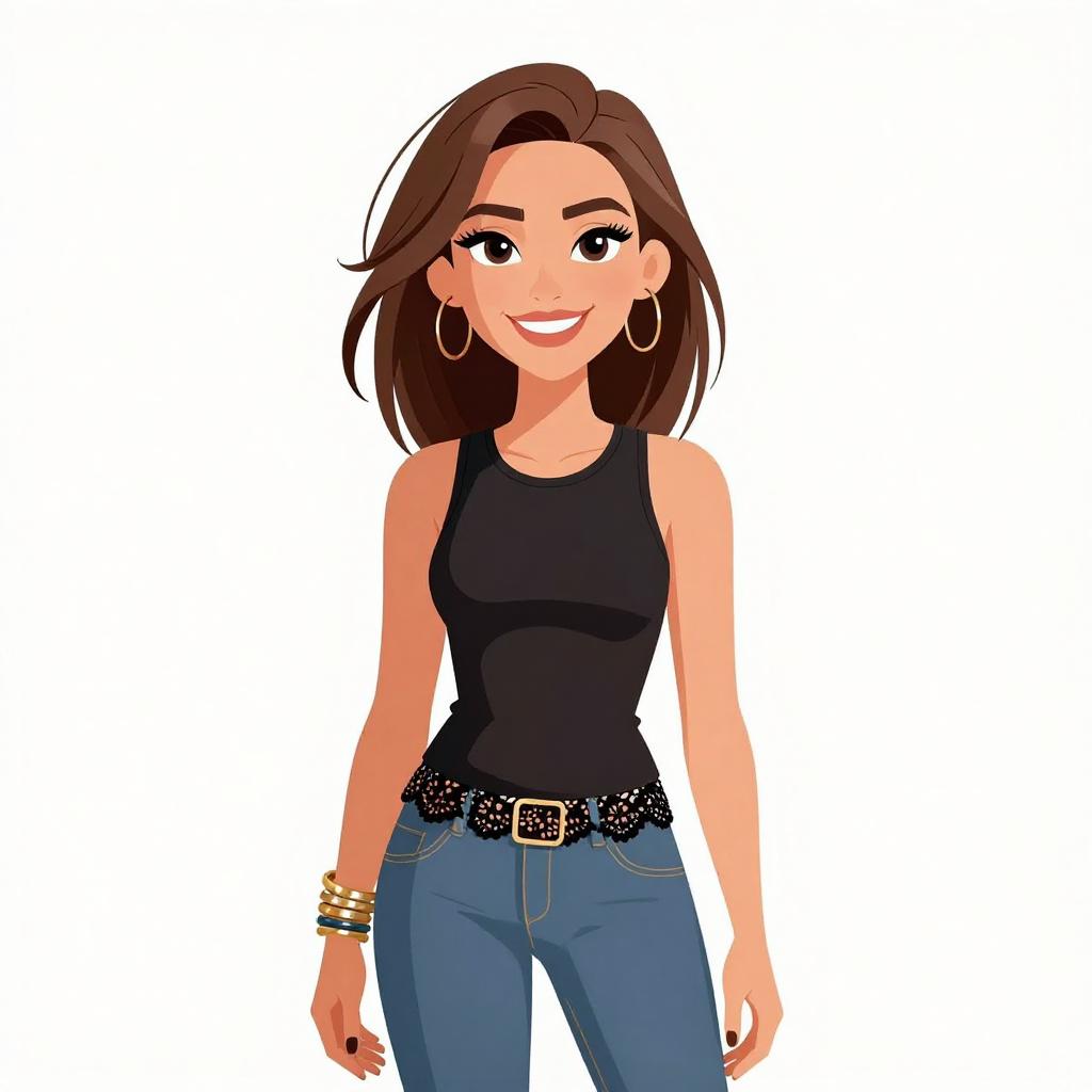 Woman with pretty face and pretty hair. smiling Woman, casual, black sleeveless top with graphic text, scoop neckline, tucked into maroon skinny pants, high-waisted, zipper detail, chain belt with interlocking circles, oversized sunglasses, black nail polish. --sref 1467