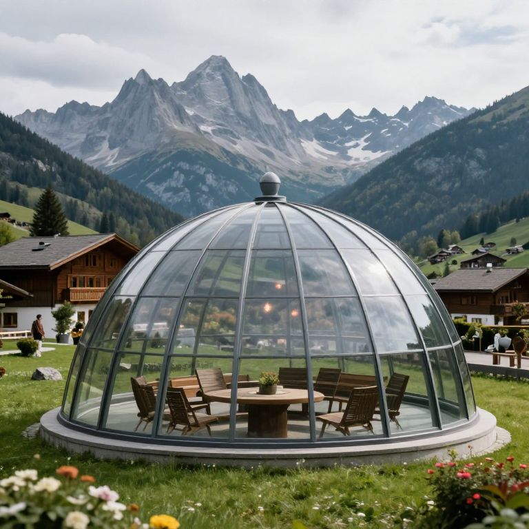 Photograph of a glass dome conservatory with wooden chairs and table, set in a lush green meadow, surrounded by alpine houses and towering mountains