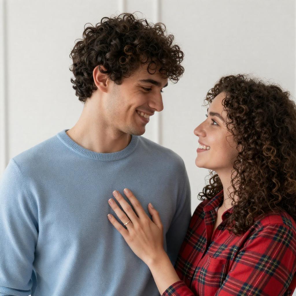 Photograph of a man and woman. Man with dark curly hair, smiling, wearing light blue sweater. Woman with curly brown hair, smiling, wearing red plaid shirt, hand on his chest, gold ring on finger. Indoor setting, white paneled wall background.
