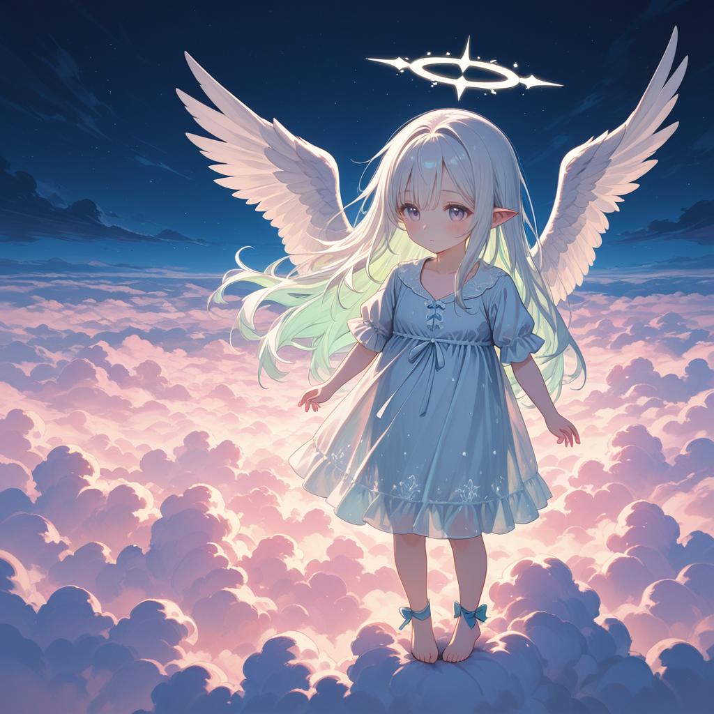 Digital artwork of a toddler female angel with long white and green gradient hair, pointed ears, and light green eyes. She wears a light blue nightdress and ankle bows, standing barefoot on a cloud above a sea of glowing clouds at night. The angel has large white feathered wings and a glowing halo, set against a deep blue starry sky.