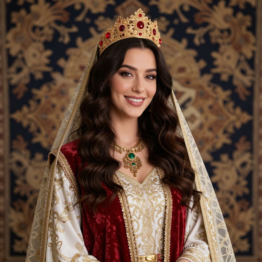 Photograph of a beautiful woman with long, wavy dark brown hair, wearing a golden crown adorned with red jewels. She's dressed in an ornate white and gold robe with intricate patterns, a red velvet vest, and a matching veil. She has a warm smile and wears a gold necklace with a green jewel. The background features a richly patterned, dark blue and gold tapestry.