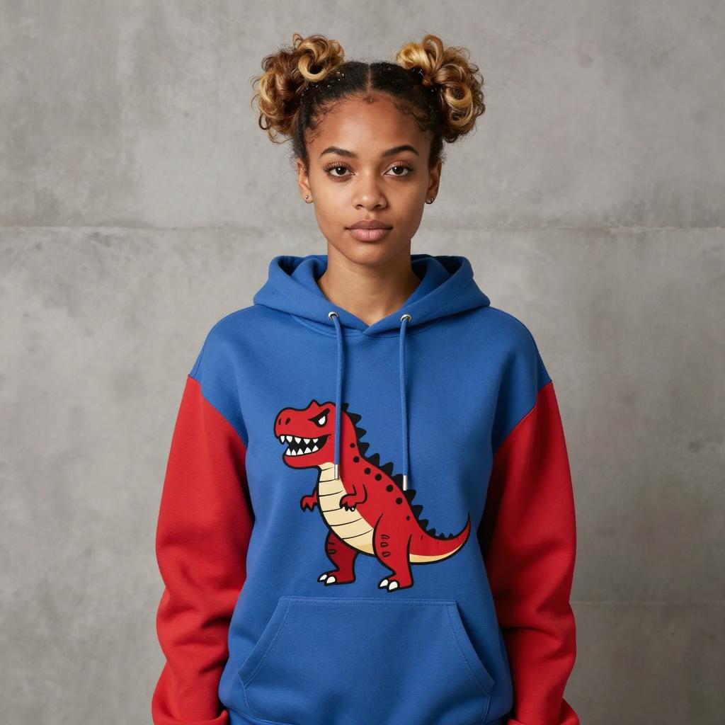 Portrait of a young woman with brown skin and hair styled in two buns with blonde highlights, wearing a blue and red casual hoodie featuring an angry red devil dinosaur graphic. The background is a textured, neutral concrete wall with vignetting effect.