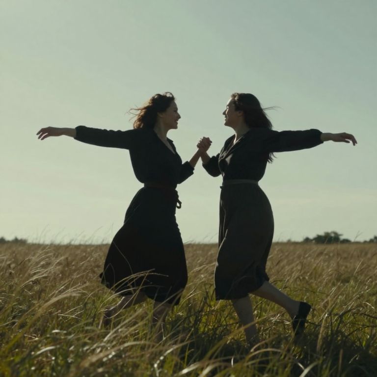 Two figures in motion capture the ephemeral dance of freedom and connection, their flowing silhouettes and outstretched arms embodying the boundless joy of shared moments, while the whispering breeze and rustling grass evoke a sense of timeless serenity.