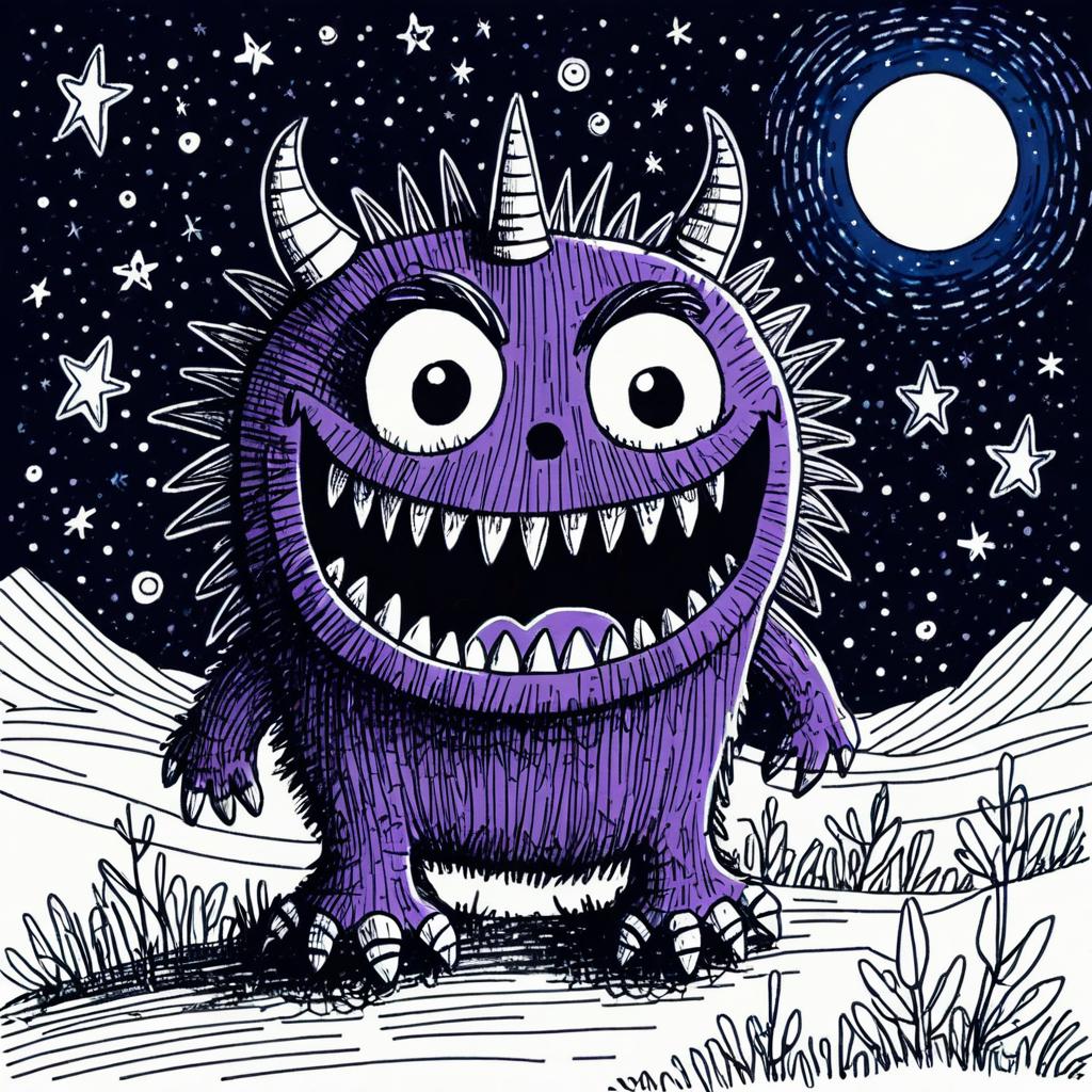(child's drawing:1.4) of a toothy monster, simple line art, bright colors, moonlit night with sparkling stars, purple and blue