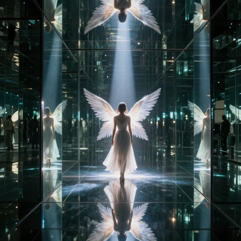 In a labyrinthine hall of infinite mirrors, a solitary figure with ethereal wings stands silhouetted against a radiant beam of light, casting an otherworldly reflection that dissolves into the mirrored depths.