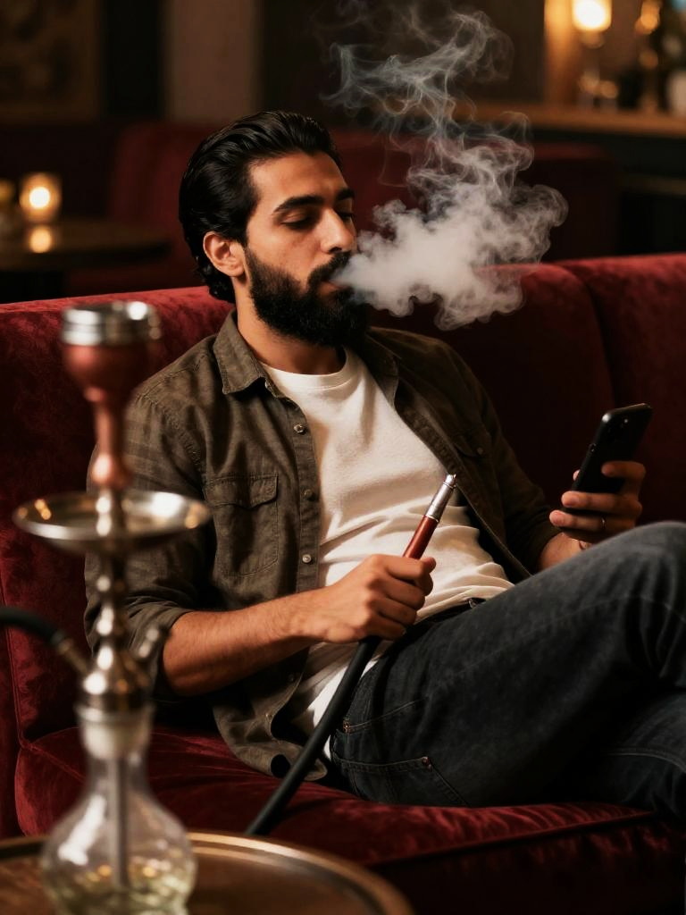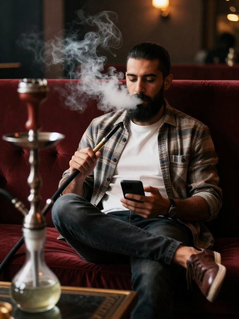 Man smoking shisha, relaxed adult man sitting on a plush sofa in a lounge, olive-skinned man with full beard and slicked-back hair wearing casual t-shirt layered under an open checked shirt with dark jeans, holding the shisha hose in one hand while looking at his phone in the other, dense cloud of smoke drifting from his mouth, ornate hookah with glass base placed on a low table in the foreground, rich warm lighting, deep red upholstery, cinematic lifestyle photo, realistic, high resolution