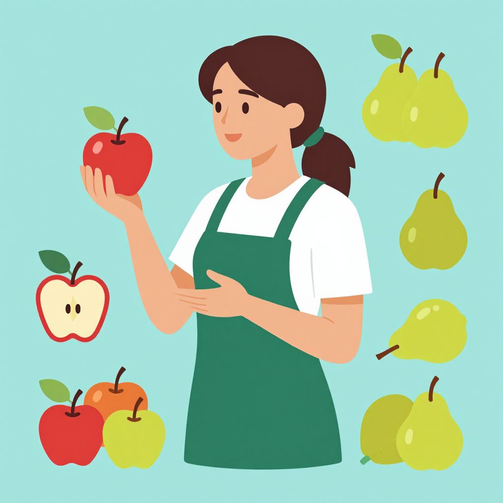 Digital illustration of a smiling woman with brown hair in a green apron and white shirt, holding a red apple, surrounded by various colorful pears and