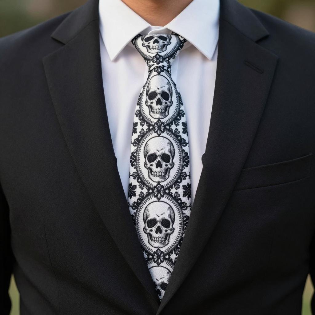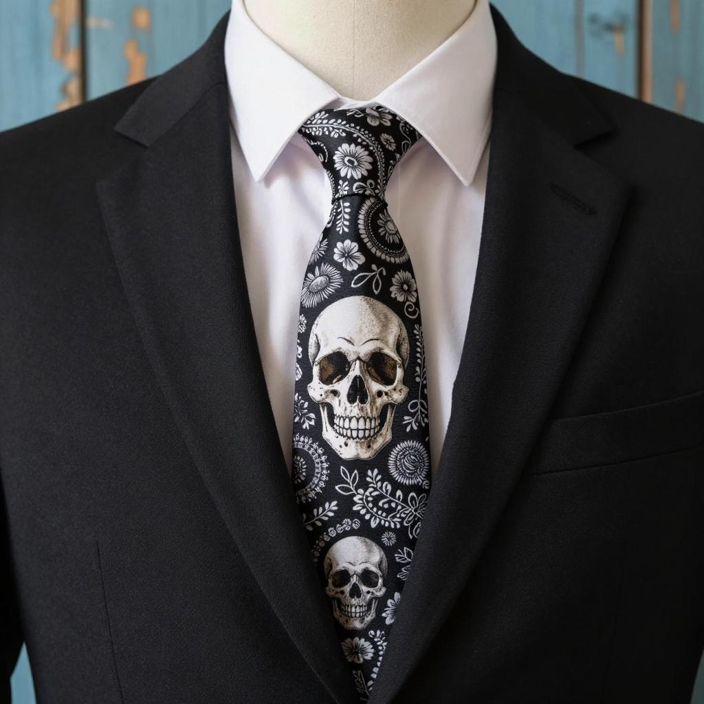 Mannequin in black suit with white shirt and black skull and floral patterned tie. Skull is centered on tie, surrounded by intricate floral designs. Background has weathered blue wooden planks. Close-up, upper torso view. Photo.