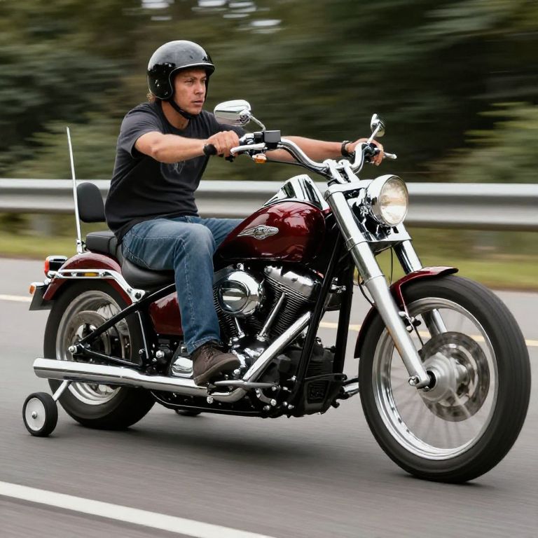Reference Photos tough biker riding big powerful chopper motorcycle with lots of chrome, on highway, but it has old fashioned, kids bicicle training wheels, on the back of the chopper.,